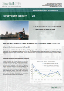 The UK economy stalled sharply in Q3, with GDP growth falling to just +0.1%, well below the +0.2% consensus and the BoE's +0.4% expectation. This reversal follows a strong first half of the year and is primarily driven by global trade tensions and weak external demand affecting the productive sector. Consequently, we have revised our 2025 annual growth forecast downward to a range of +0.9% to +1.0%.